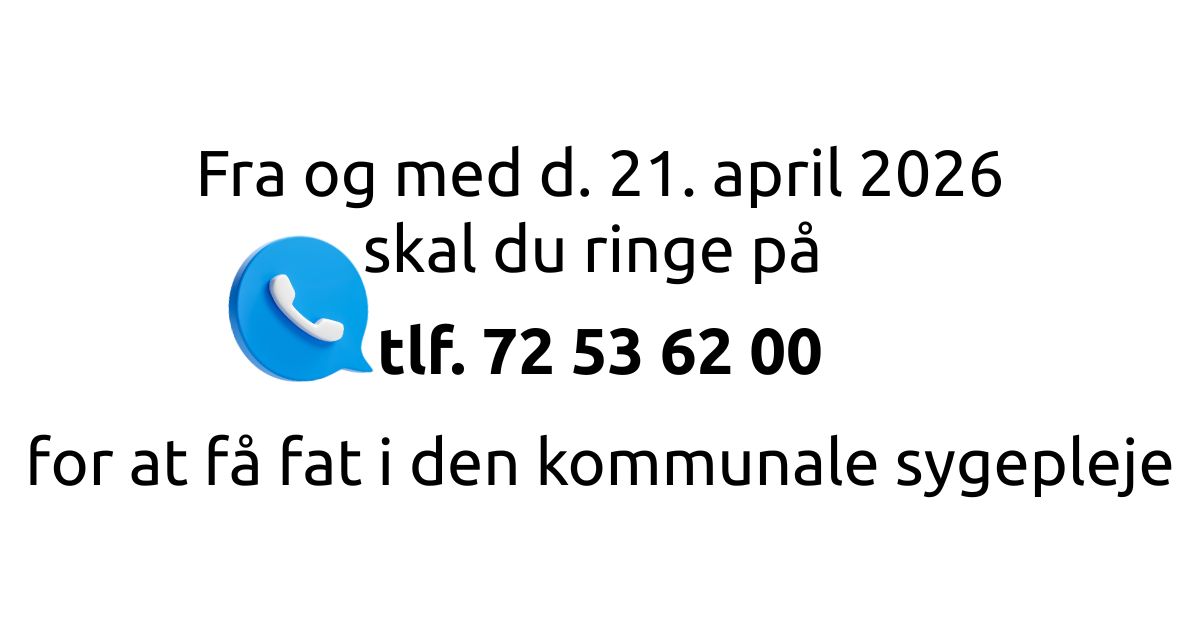 Den kommunale sygepleje i Faaborg‑Midtfyn Kommune får ét fælles telefonnummer. Nummeret til den kommunale sygepleje er pr. d. 21. april: 72 53 62 00.