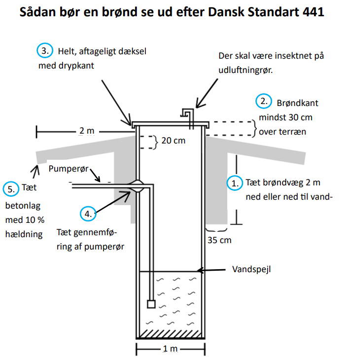 1. Brøndvæggen skal være tæt mindst 2 m ned, eller ned til vandspejlet.