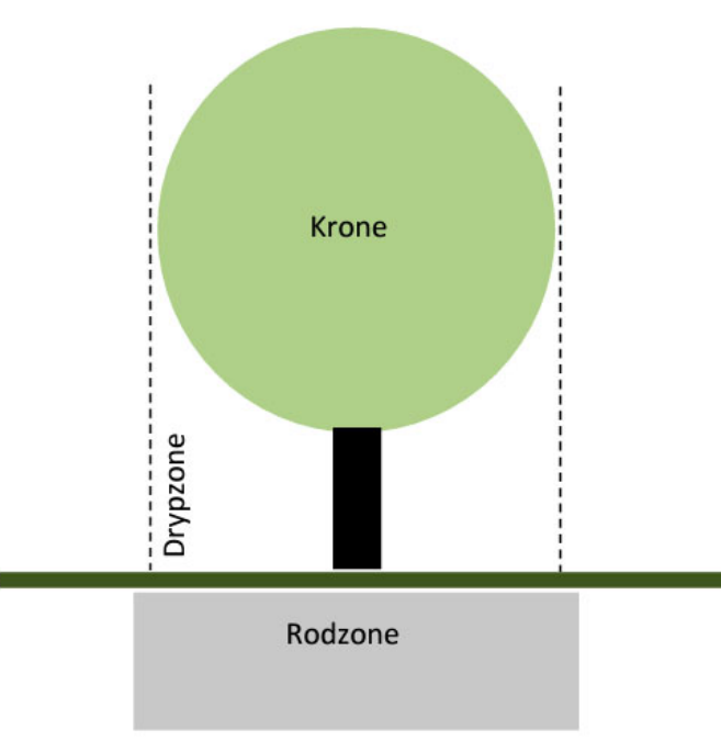 Drypzonen er området under træets eller beplantningens krone. I drypzonen er træets primære rødder. Træer og beplantninger kan have rødder, der går ud over drypzonen.