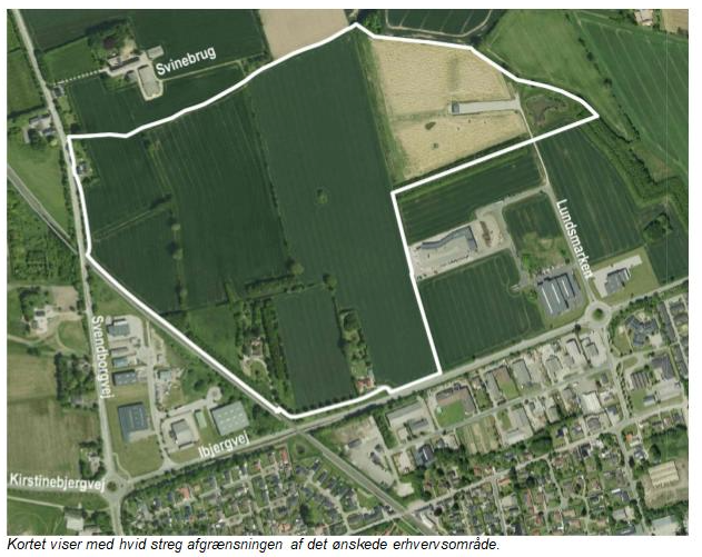 En udvidelse af erhvervsområdet ved Lundsmarken forudsætter, at der udarbejdes et tillæg til kommunepla-nen og en mere detaljeret lokalplan for området.