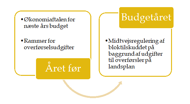 Finansieringen fastsættes på landsplan hvert år med Økonomiaftalen. KL udarbejder i samarbejde med Finansministeriet et skøn for kommunernes samlede udgifter og et kommunespecifikt skøn på udvalgte områder. Dette tager udgangspunkt i regnskabet for året før, indeværende år samt den forventede udvikling. Der er dermed lagt et statsligt niveau. KL udmelder på den baggrund et skøn for kommunens økonomiske ramme for overførselsudgifter. Hertil kommer en midtvejsregulering i budgetåret, jf. nedenstående figur.