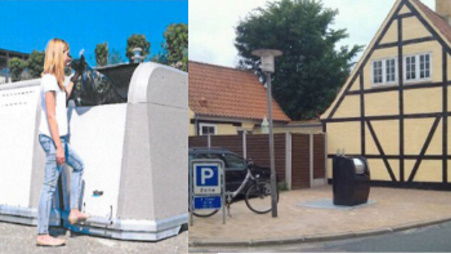 Figur 3. Illustration af en fælles overjordisk beholder som kunne placeres i Faaborg midtby. Og et billede af en nedgravet fællesbeholder vi allerede kender fra Faaborg midtby og som kunne placeres flere steder.