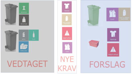 Som led i regeringens klimaplan er der en målsætning om mere ensartet affaldssortering og mere kildesortering i landet. Der er kommet krav om sortering af 10 typer affald ved alle husstande. Den ordning som kommunalbestyrelsen allerede har vedtaget, sættes i gang i starten af 2022, og skal derfor suppleres. Der skal udover det som allerede er planlagt også sorteres tekstil, plast, drikke- og fødevarekartoner samt farligt affald.