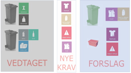 Som led i regeringens klimaplan er der en målsætning om mere ensartet affaldssortering og mere kildesortering i landet. Der er kommet krav om sortering af 10 typer affald ved alle husstande. Den ordning som kommunalbestyrelsen allerede har vedtaget, sættes i gang i starten af 2022, og skal derfor suppleres. Der skal udover det som allerede er planlagt også sorteres tekstil, plast, drikke- og fødevarekartoner samt farligt affald.