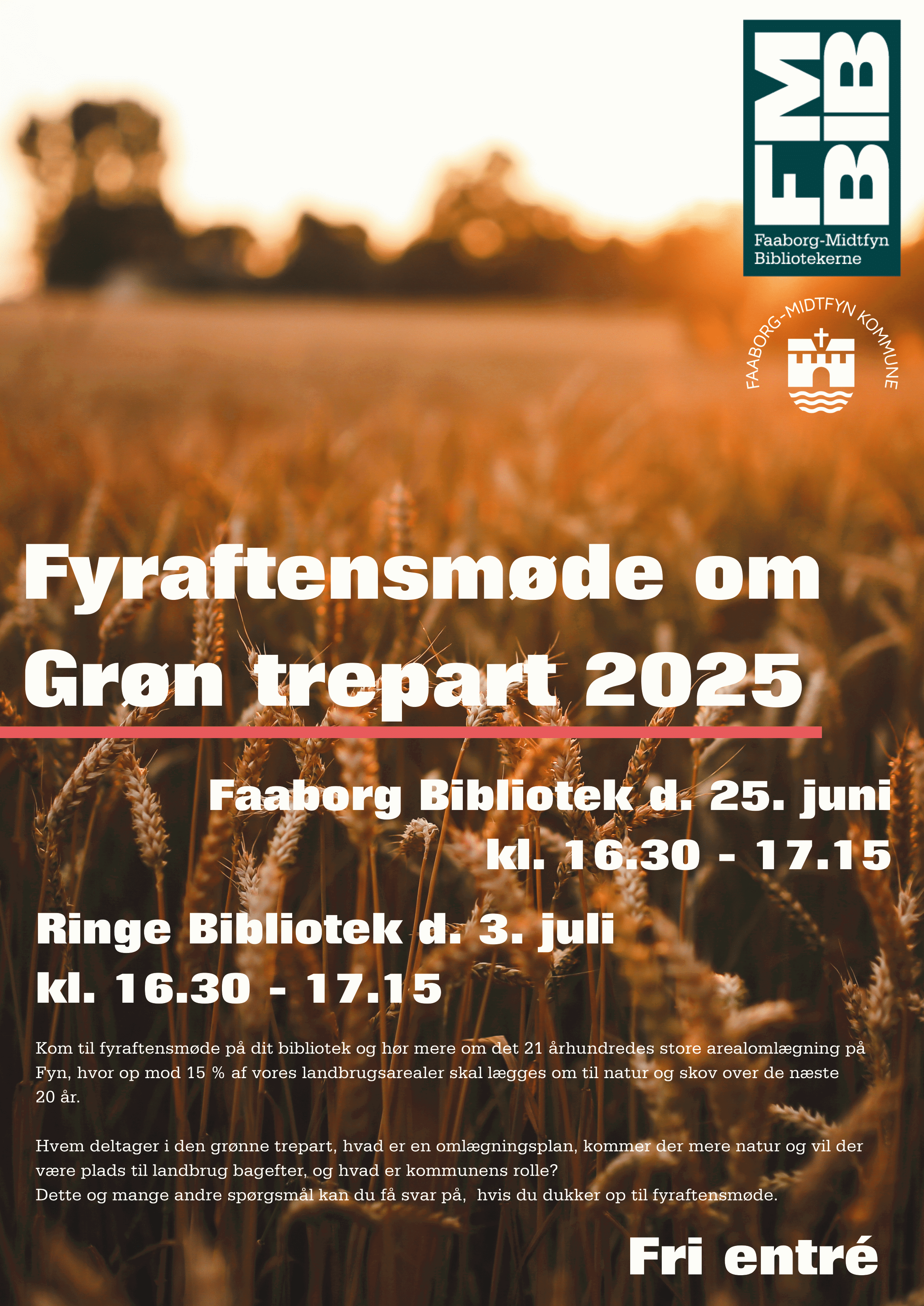 På møderne får du mulighed for at høre om planerne for, hvordan op mod 15 % af Danmarks landbrugsjord skal omlægges til natur og skov frem mod 2045 – og hvordan det konkret kommer til at påvirke både lokalsamfund, landbrug og natur i Faaborg-Midtfyn Kommune.