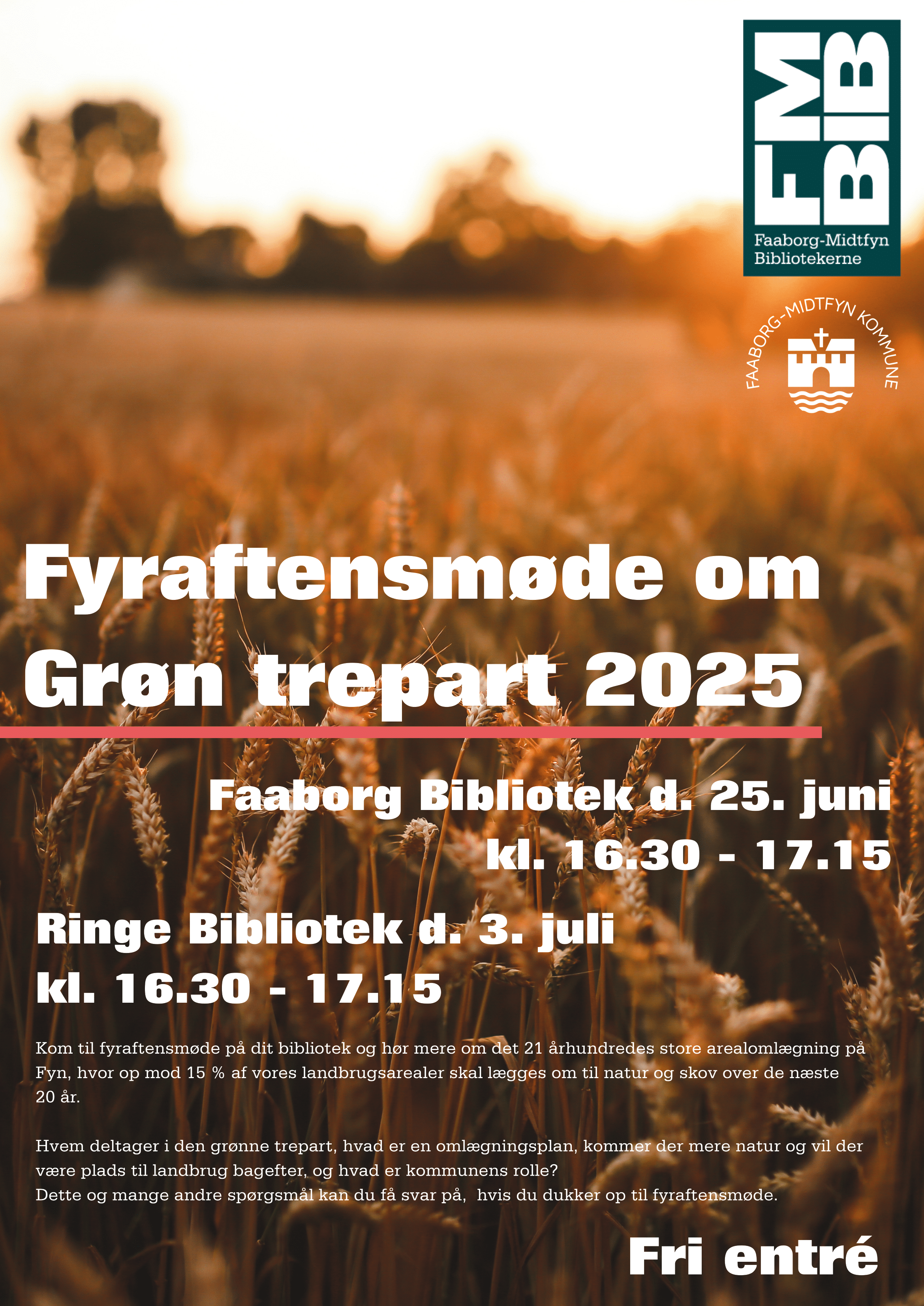 På møderne får du mulighed for at høre om planerne for, hvordan op mod 15 % af Danmarks landbrugsjord skal omlægges til natur og skov frem mod 2045 – og hvordan det konkret kommer til at påvirke både lokalsamfund, landbrug og natur i Faaborg-Midtfyn Kommune.