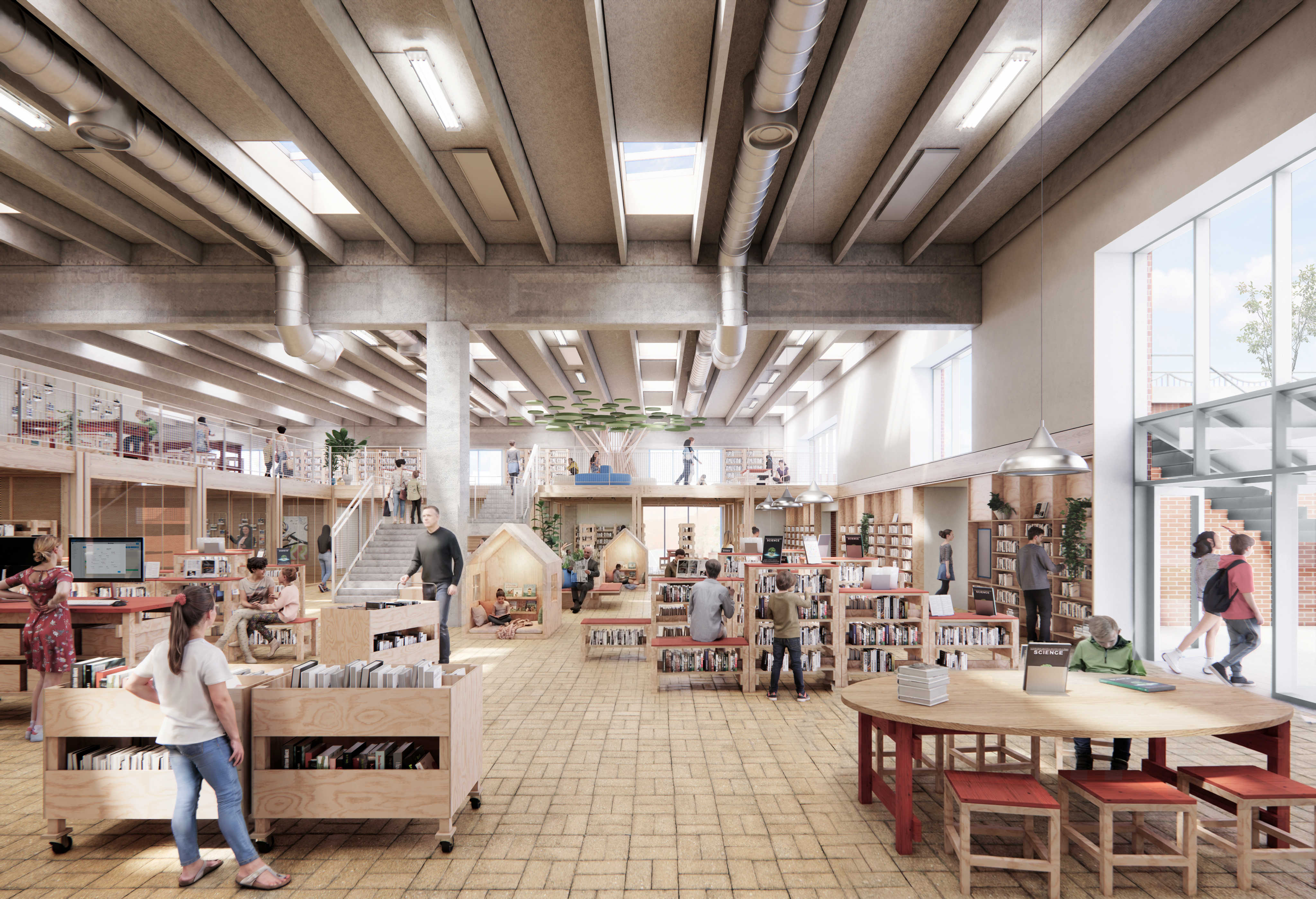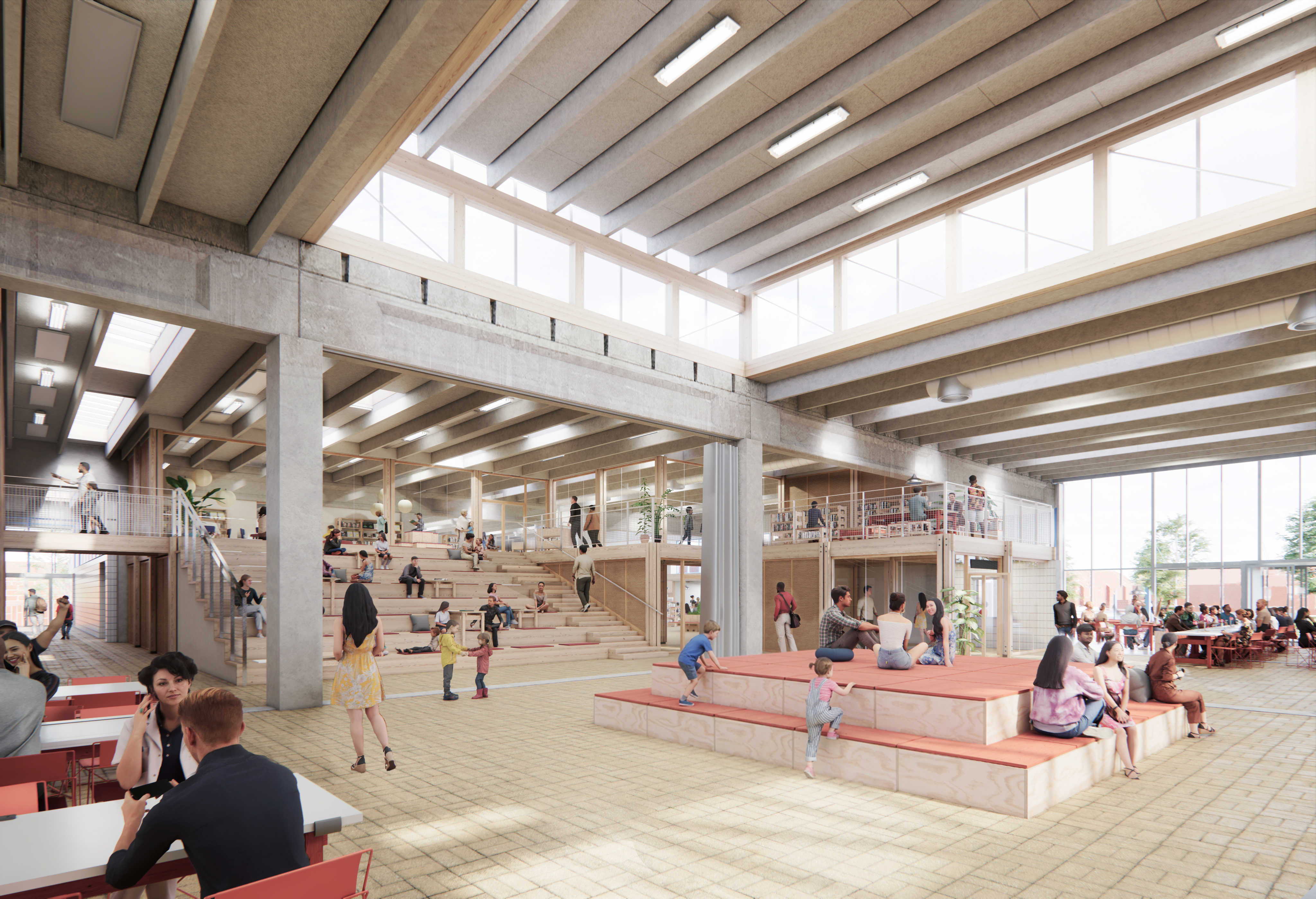 Projektets hjerte er et stort indendørs torv – et fleksibelt rum, hvor bibliotek, foreningsliv, kultur, events og fødevareiværksætteri smelter sammen. Her kan aktiviteter flyde ind og ud af hinanden og videre ud i de omkringliggende udearealer på havnen.