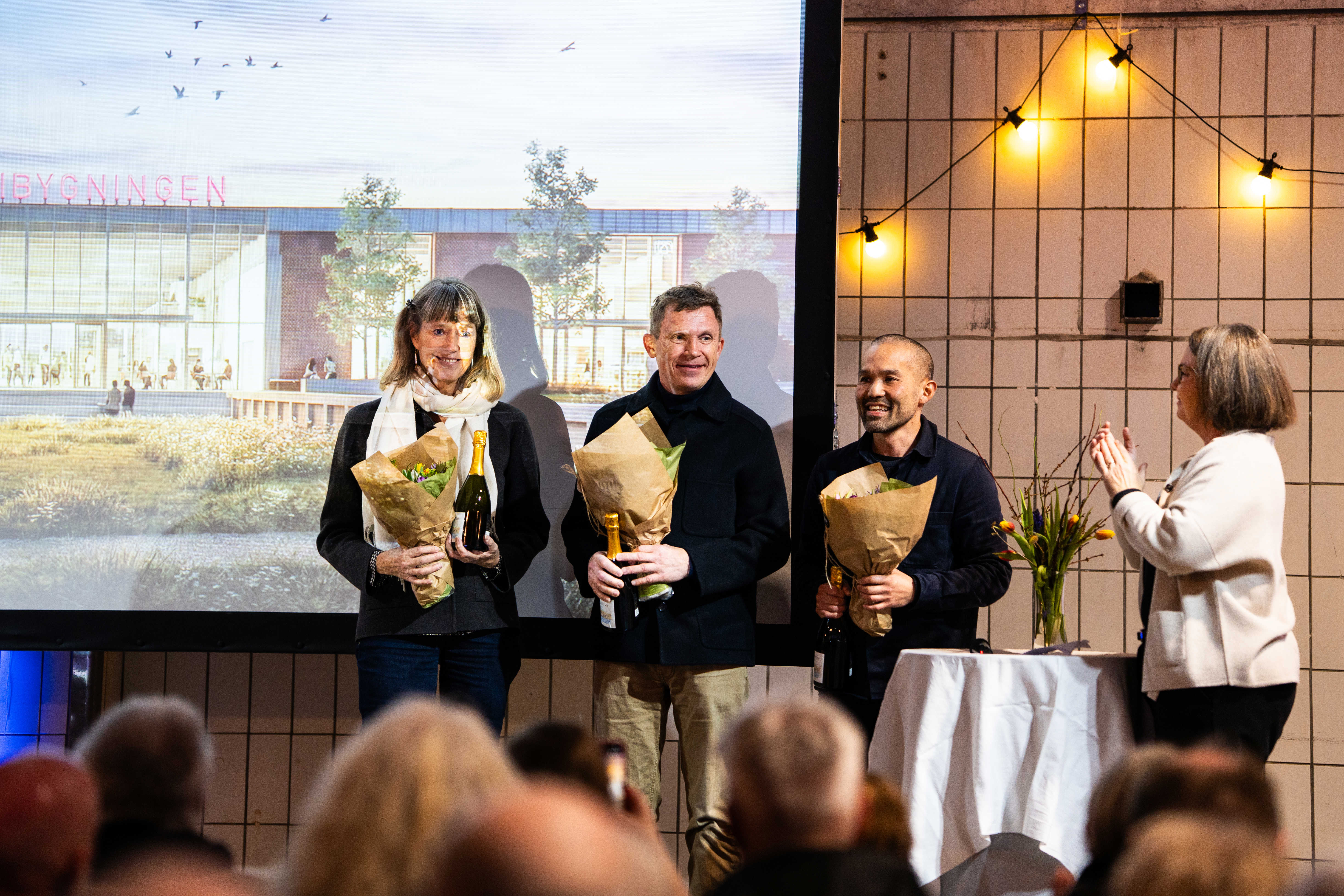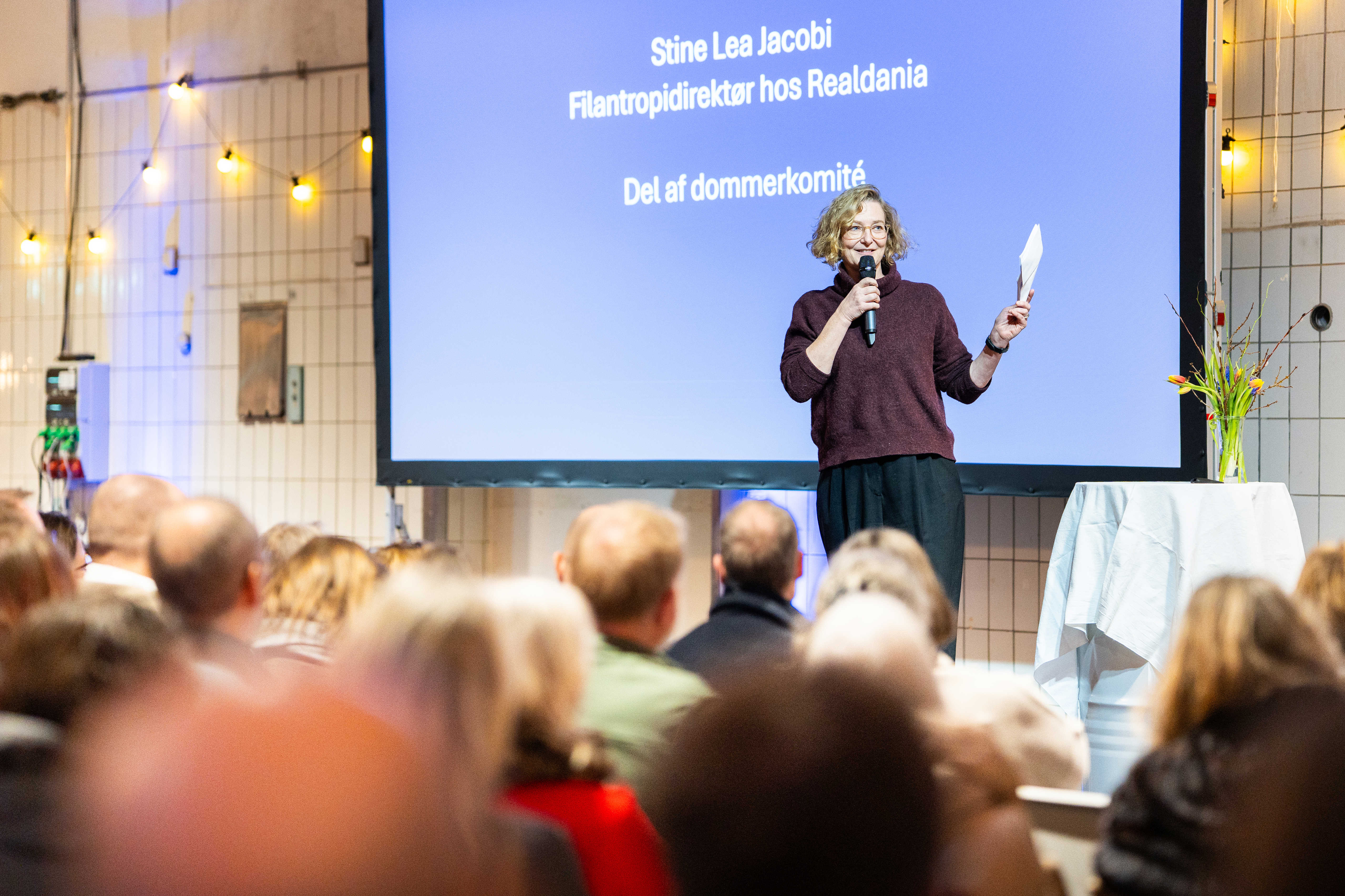 Gyrithe Saltorp, formand for ejendomsfonden, annoncerede vinderteamet fra scenen.