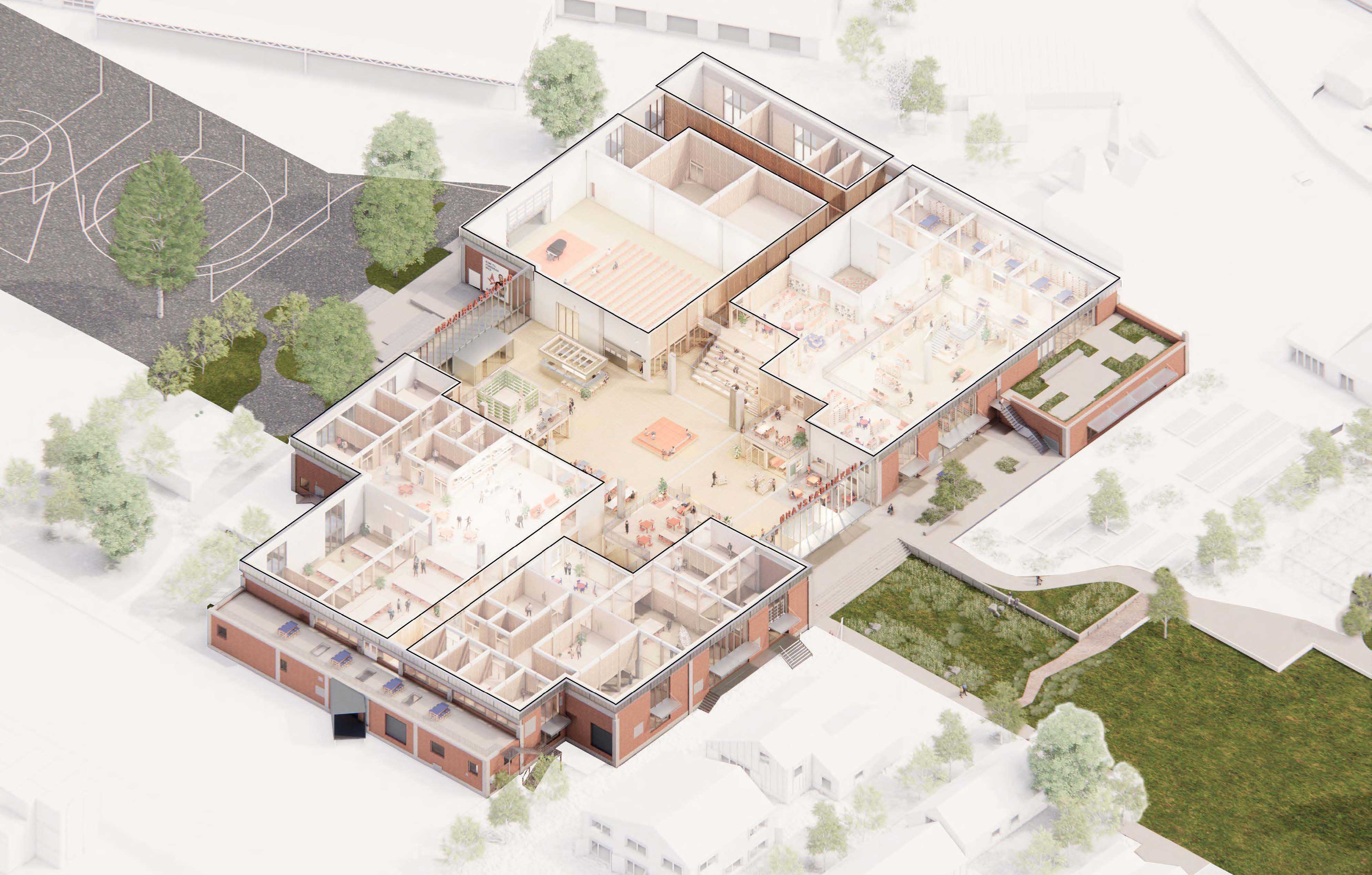 Vinderprojektet tager afsæt i et markant, men enkelt hovedgreb: At bevare så meget som muligt af den eksisterende bygning og tilføre præcist det nødvendige for at skabe et åbent og fremtidssikret fællesskabshus.